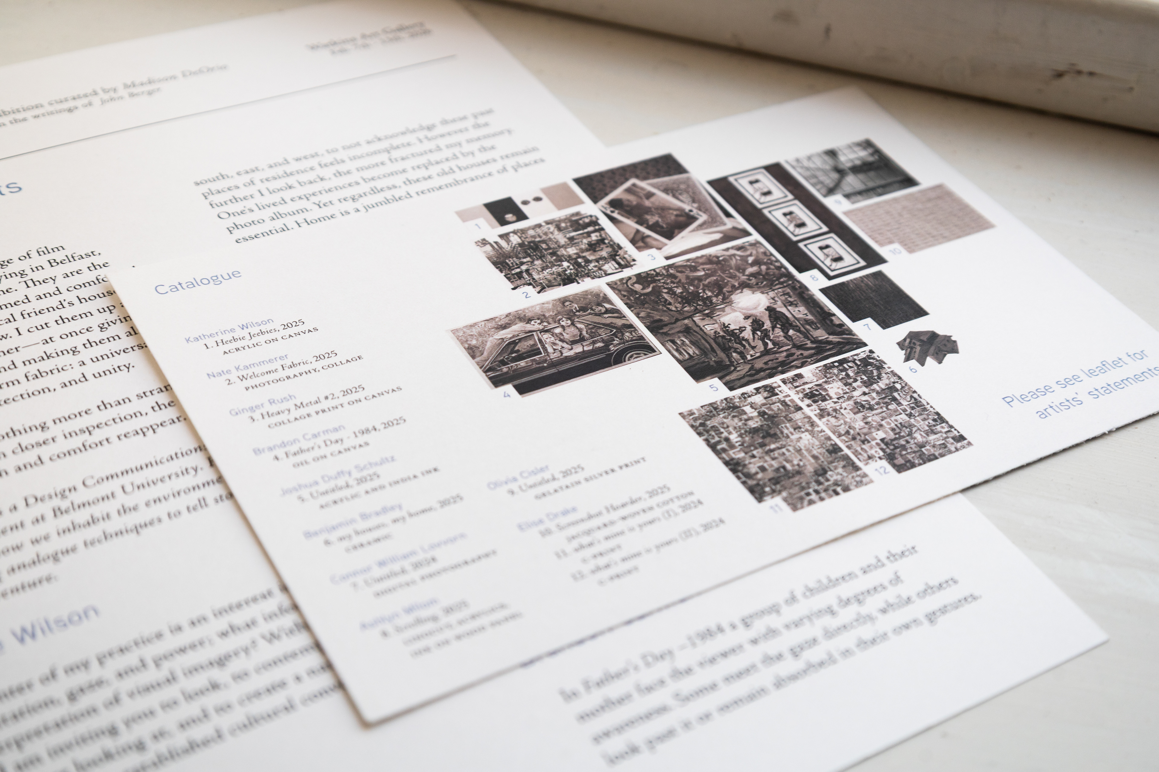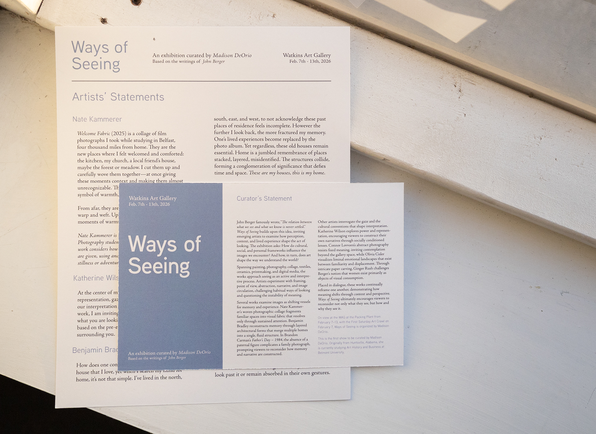 For her curatorial debut, Madison DeOrio invited peers from the Watkins College of Art at Belmont University to respond to John Berger's art history staple, Ways of Seeing. My design reinforced her curatorial vision, delivering balance and structure to a diverse, multi-media exhibition.